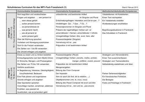 Schulinternes Curriculum Fur Das Wp1 Fach Franzosisch 1 Der